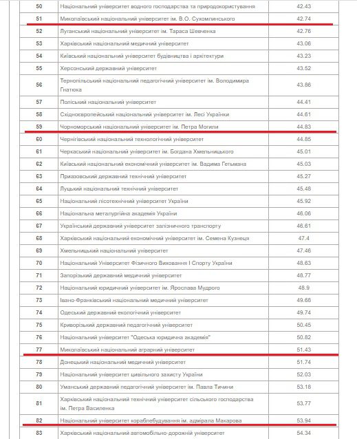 Во всеукраинский рейтинг уже традиционно вошло четыре николаевские университета, но их позиции значительно отличаются от прошлогодних. В 2019 году 62 место занимал ЧНУ имени Петра Могилы, 86 — Национальный университет кораблестроения имени адмирала Макарова, 87 — Николаевский национальный университет им. В.А. Сухомлинского, а Николаевский национальный аграрный университет был аж на 114 позиции.
