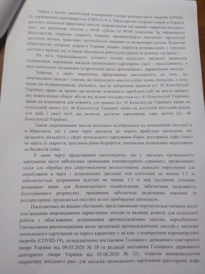 В поддержку николаевских предпринимателей сегодня первый заместитель городского головы Владимир Крыленко уже направил обращение к председателю Государственной комиссии ТЭБ и ЧС, Премьер-министру Денису Шмыгалю с призывом не вводить карантин выходного дня.