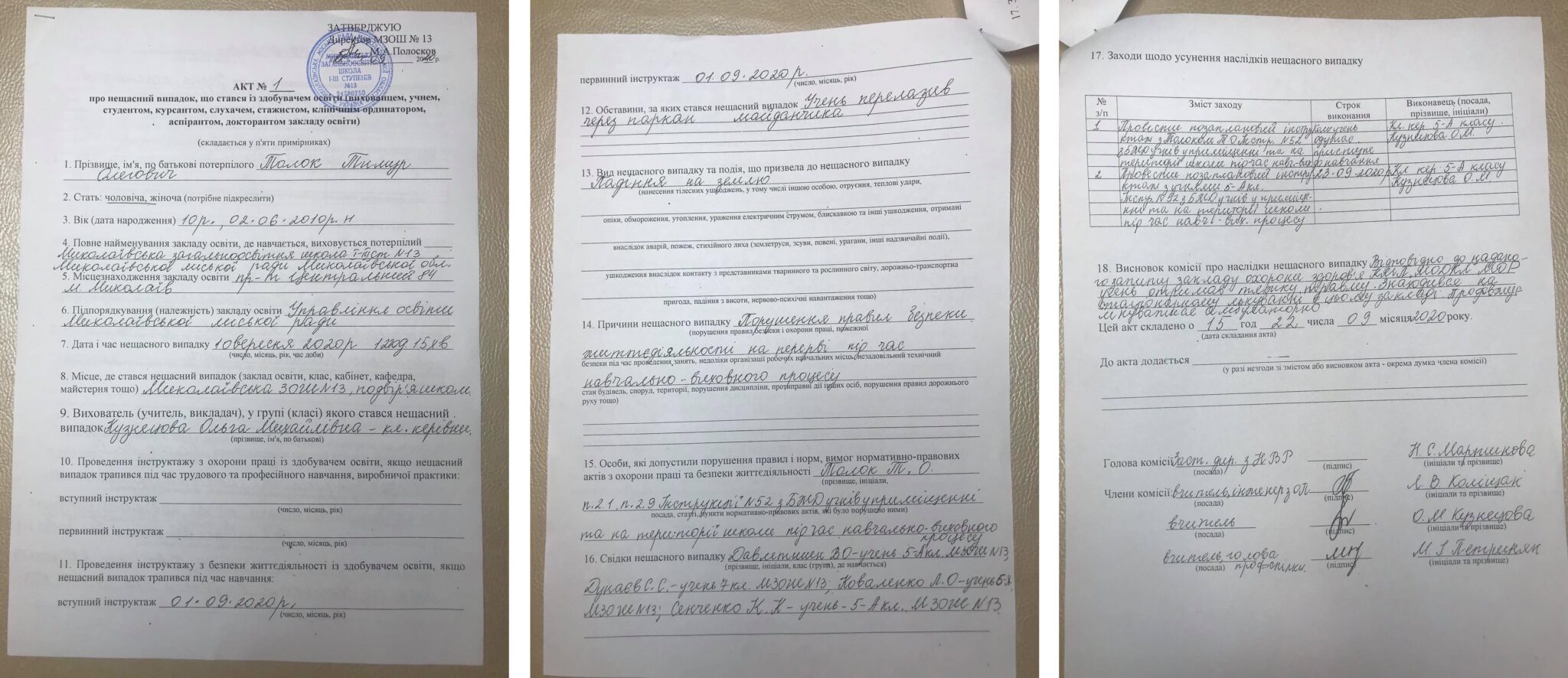 Недавно николаевцев ошеломила новость о том, что после конфликта на уроке физкультуры, травли со стороны учителя и сверстников, пятиклассник Тимур Толок убегал от обидчиков и получил двойной открытый перелом правой руки. О тяжелой травме сына Лине Толок сообщила мать одноклассницы пострадавшего. Все произошло на перемене на территории общеобразовательной школы №13 еще 10 сентября. Уже в течение 10 минут женщина была в школе и увидела, как ее сын кричит,  что сейчас умрет от боли. В это же время медсестра даже не перебинтовала рану, из которой торчали кости ребенка. Обезболивающий укол и повязку сделали уже медики скорой помощи, прибывшие на вызов еще через 10-15 минут, рассказывает «mykolaiv.one«