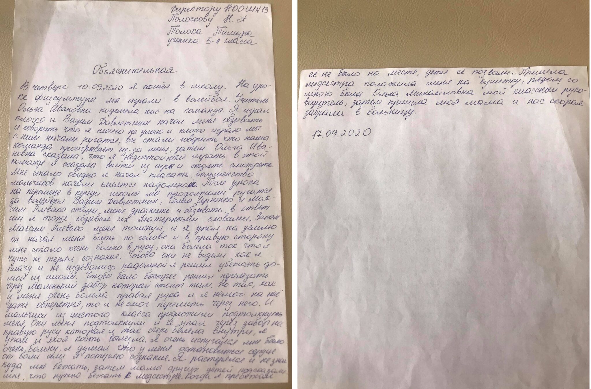 Напомним, что конфликт, который закончился двойным открытым переломом руки, начался именно на уроке физкультуры. Во время игры в волейбол команда, в которой играл Тимур, проиграла. Его стали обвинять в проигрыше, насмехаться, а учитель физкультуры вместо того, чтобы разрешить конфликт, подлила масла в огонь. Она назвала его «недостойным игроком» и выгнала, дальше насмешки продолжались. Пятиклассник не выдержал давления и расплакался. Уже на перемене конфликт еще больше обострился. От ругани дети перешли к физическому насилию. После нескольких ударов Тимур почувствовал сильную боль в голове и правой руке, поэтому решил сбежать в здание школы. Он пытался перелезть через небольшой забор, но упал и получил двойной открытый перелом руки. Далее представлена ​​пояснительная записка мальчика.