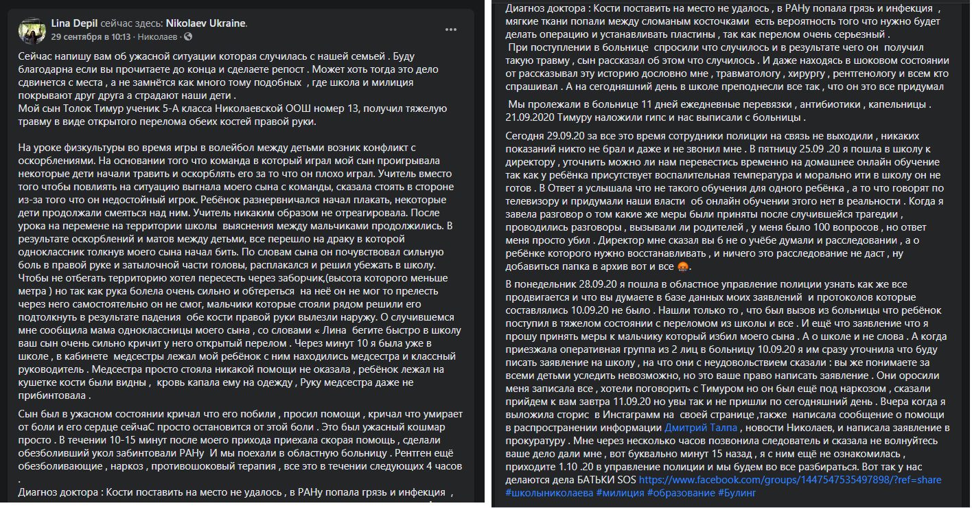 «Нашли только то, что был вызов из больницы, что ребенок поступил с школы в тяжелом состоянии с переломом из школы и все. И еще заявление, что я прошу принять меры в отношении мальчика, который избил моего сына. А о школе ни слова. А когда приезжала оперативная группа из двух лиц в больницу 10.09.20, я им сразу уточнила, что буду писать заявление на школу», — добавила мама парня.