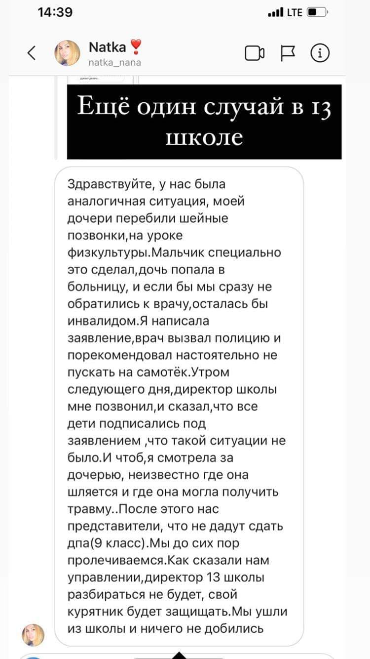 К большому сожалению, после обнародования информации о пострадавшем мальчике, горожане начали делиться своими страшными историями об обучении и страданиях в школе №13. Одной из пострадавших парень прямо на уроке физкультуры специально перебил шейные позвонки. Девушку срочно госпитализировали. Когда пострадавшие обратились к директору школы, то он заявил, что школьники подписались под заявлением, что такой ситуации вообще не было. Пострадавшую девушку начали унижать, в конце концов  она перешла в другую школу.