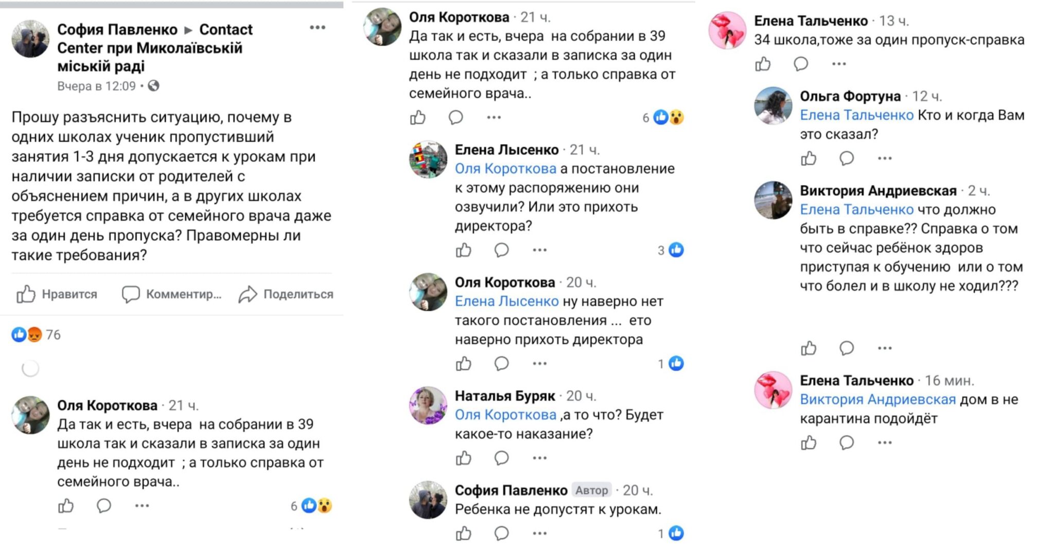 Жительница Николаева София Павленко решила выяснить правомерны ли  вообще такие действия школы и обратилась по поводу требования предоставлять справку от педиатра из-за краткосрочного  отсутствия в городской Contact Center. На данный момент ее обращения до сих пор не зарегистрировали, однако родители из школ №39 и 34 подтвердили, что услышали такое же требование от директора или учителей школы во время последнего собрания.