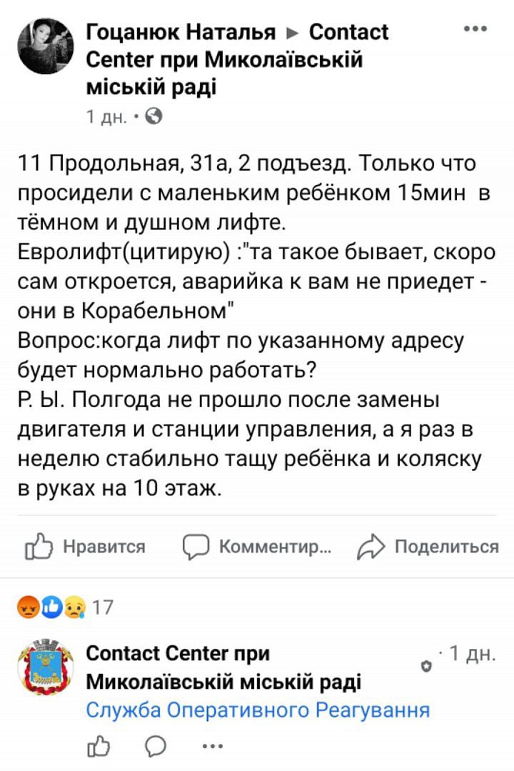 У більшості миколаївських багатоповерхівок ліфти працюють з останніх сил або взагалі простоюють, адже грошей на їх ремонт немає. Чергова поїздка у ліфті ледь не закінчилась трагедією для мешканки багатоповерхівки з другого під’їзду за адресою 11 Поздовжня, 31а. Наталія Гоцанюк та її маленька дитина опинилися у заручниках ліфта, який несподівано зупинився, тож вони виявилися замкнутими у темному та душному приміщенні. Про відповідний інцидент мешканка повідомила до міського Contact Center, пише mykolaiv.one.