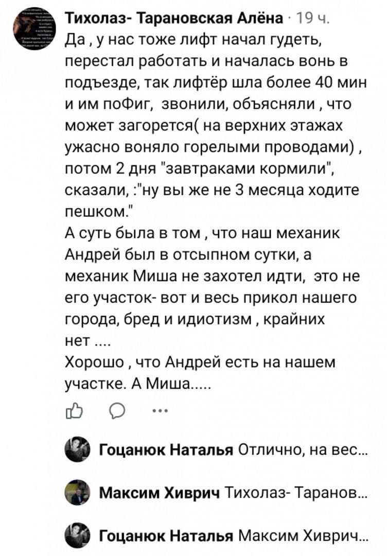 Виявилось, що така байдужість та бездіяльність організації, що обслуговує міські ліфти є системною. Альона Тихолаз-Тарановська повідомила, що в їх випадку ліфт не просто зупинився, а почав гудіти та по під’їзду поширився неприємний запах. На верхніх поверхах тхнуло горілою проводкою, але ліфтер особливо не поспішала та йшла на виклик більше 40 хвилин. Після цього декілька днів “годували” обіцянками полагодити ліфт. Виявилось, що ремонт не зробили відразу тому що механік з іншої ділянки не захотів виконувати цю роботу, а закріплений робітник мав вихідний.