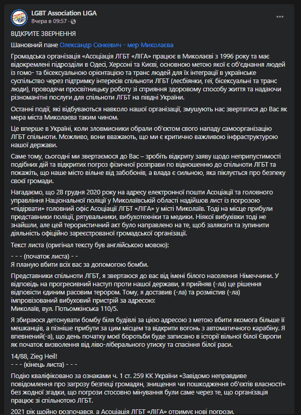 У Миколаєві люди з гомо-, бісексуальною орієнтацією та транссексуали, що об’єдналися в “Асоціацію ЛГБТ “Ліга”, потерпають від погроз підірвати їх офіс та вбити представників спільноти. Відповідні листи з погрозами надходять на електронну адресу “Асоціації ЛГБТ”, тож її члени звернулися з відкритим листом до мера міста Олександра Сєнкевича, повідомляє “mykolaiv.one”.