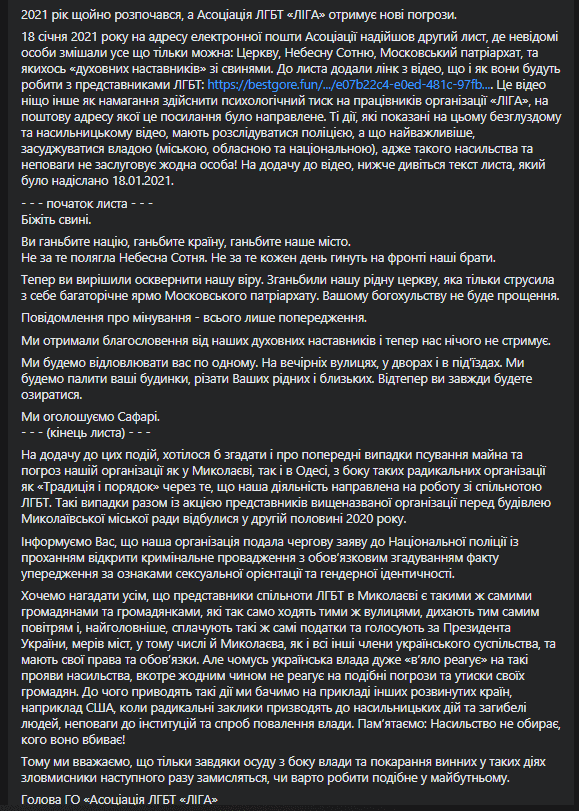 Проте, на цьому зловмисники не зупинилися і 18 січня на адресу електронної пошти “Асоціації ЛГБТ “Ліга” надійшов ще один лист із “оголошенням сафарі” на членів спільноти. Тепер невідомі погрожують палити будинки, фізично розправлятися з рідними та близькими, а також чатувати на людей з нетрадиційною орієнтацією на вечірніх вулицях, у дворах та будинках.